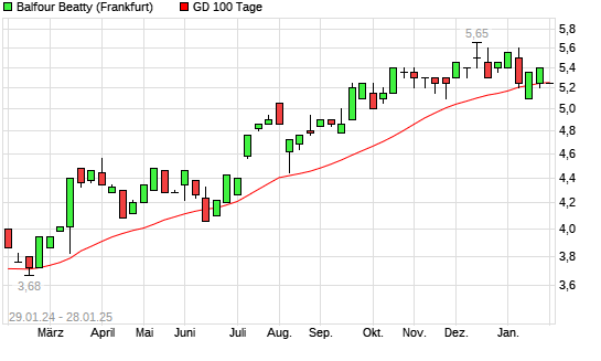 Mit dem Rücksetzer auf 5,25 EUR hat die Balfour Beatty-Aktie am 27.01.2025 die 100-Tage-Linie nach unten gekreuzt.