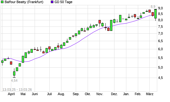 Mit dem Anstieg auf 8,90 EUR hat die Balfour Beatty-Aktie am 12.03.2026 die 50-Tage-Linie nach oben gekreuzt.Die Balfour Beatty-Aktie befindet sich seit dem 28.04.2025 im ...weiterlesen