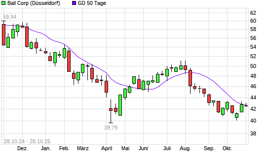 Mit dem Rücksetzer auf 42,67 EUR hat die Ball-Aktie am 27.10.2025 die 50-Tage-Linie nach unten gekreuzt.