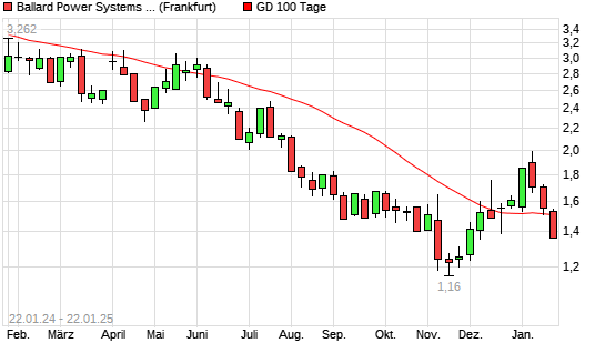Mit dem Rücksetzer auf 1,46 EUR hat die Ballard Power-Aktie am 21.01.2025 die 100-Tage-Linie nach unten gekreuzt.