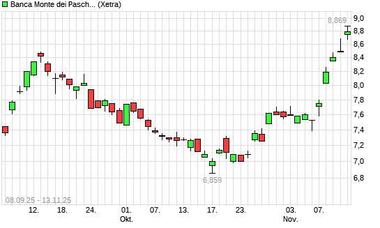 Mit dem Anstieg auf 8,63 EUR hat die Banca Monte Dei Paschi-Aktie (ISIN IT0005508921) am 12.11.2025 ein neues 3-Jahres-Hoch erreicht und damit den Kurs vom 11.11.2025 eingestellt.