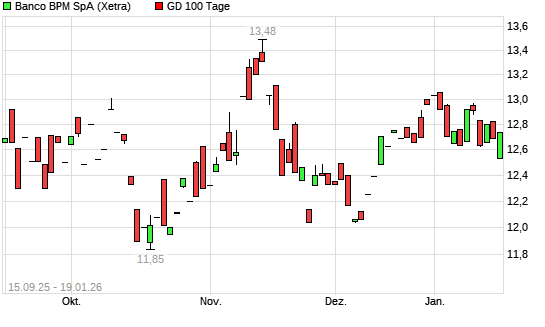 Mit dem Rücksetzer auf 12,49 EUR hat die Banco BPM-Aktie am 19.01.2026 die 100-Tage-Linie nach unten gekreuzt.