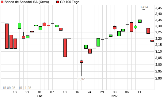 Mit dem Rücksetzer auf 3,13 EUR hat die Banco Sabadell-Aktie am 14.11.2025 die 100-Tage-Linie nach unten gekreuzt.
