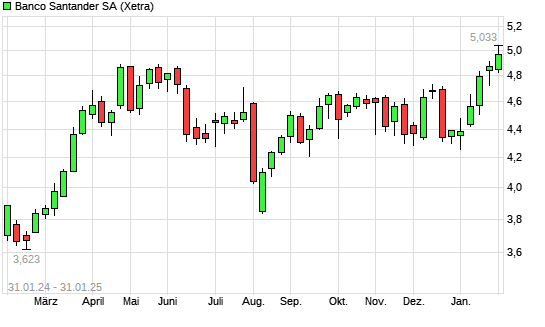 Mit dem Anstieg auf 5,00 EUR hat die Banco Santander-Aktie (ISIN ES0113900J37) am 30.01.2025 ein neues 5-Jahres-Hoch erreicht und damit den Kurs vom 29.01.2025 eingestellt.
