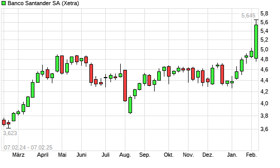 Mit dem Anstieg auf 5,60 EUR hat die Banco Santander-Aktie (ISIN ES0113900J37) am 06.02.2025 ein neues 5-Jahres-Hoch erreicht und damit den Kurs vom 05.02.2025 eingestellt.