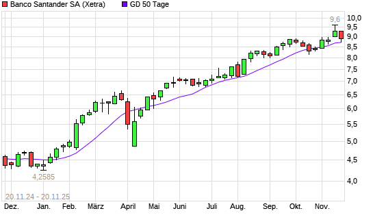 Mit dem Anstieg auf 8,95 EUR hat die Banco Santander-Aktie am 19.11.2025 die 50-Tage-Linie nach oben gekreuzt.