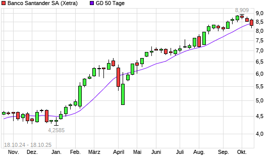 Mit dem Rücksetzer auf 8,29 EUR hat die Banco Santander-Aktie am 17.10.2025 die 50-Tage-Linie nach unten gekreuzt.