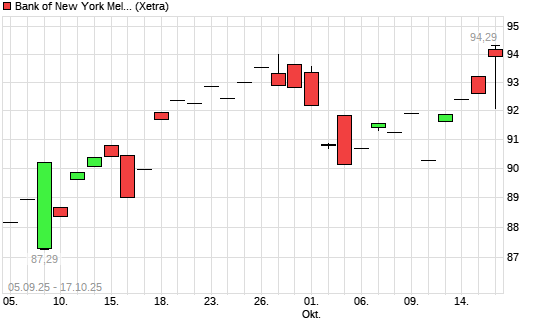 Mit dem Anstieg auf 94,06 EUR hat die Bank of New York-Aktie (ISIN US0640581007) am 16.10.2025 ein neues All-Time-High erreicht und damit den Kurs vom 29.09.2025 eingestellt.