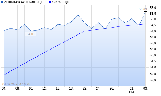 Mit dem Anstieg auf 55,63 EUR hat die Bank of Nova Scotia-Aktie am 03.10.2025 die 20-Tage-Linie nach oben gekreuzt.
