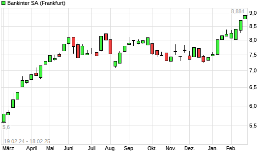 Mit dem Anstieg auf 8,77 EUR hat die Bankinter-Aktie (ISIN ES0113679I37) am 17.02.2025 ein neues 5-Jahres-Hoch erreicht und damit den Kurs vom 14.02.2025 eingestellt.