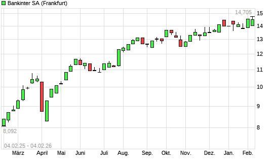 Mit dem Anstieg auf 14,70 EUR hat die Bankinter-Aktie (ISIN ES0113679I37) am 03.02.2026 ein neues All-Time-High erreicht und damit den Kurs vom 30.01.2026 eingestellt.