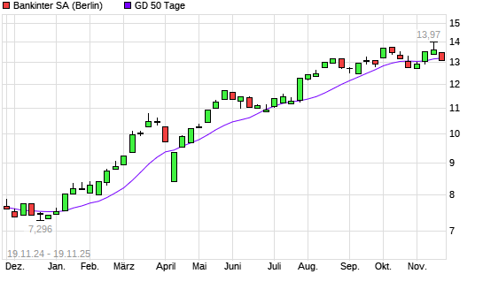 Mit dem Rücksetzer auf 12,94 EUR hat die Bankinter-Aktie am 18.11.2025 die 50-Tage-Linie nach unten gekreuzt.