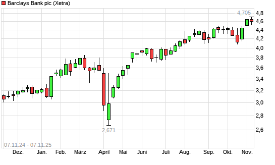 Mit dem Anstieg auf 4,67 EUR hat die Barclays Bank-Aktie (ISIN GB0031348658) am 06.11.2025 ein neues 10-Jahres-Hoch erreicht und damit den Kurs vom 29.10.2025 eingestellt.