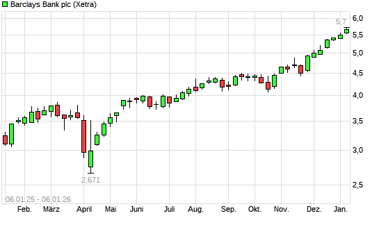Mit dem Anstieg auf 5,57 EUR hat die Barclays Bank-Aktie (ISIN GB0031348658) am 05.01.2026 ein neues 10-Jahres-Hoch erreicht und damit den Kurs vom 02.01.2026 eingestellt.