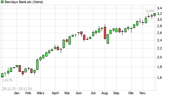 Mit dem Anstieg auf 3,19 EUR hat die Barclays Bank-Aktie (ISIN GB0031348658) am 28.11.2024 ein neues 5-Jahres-Hoch erreicht und damit den Kurs vom 25.11.2024 eingestellt.