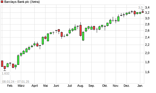 Mit dem Anstieg auf 3,30 EUR hat die Barclays Bank-Aktie (ISIN GB0031348658) am 06.01.2025 ein neues 5-Jahres-Hoch erreicht und damit den Kurs vom 16.12.2024 eingestellt.