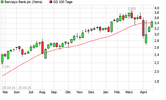 Mit dem Rücksetzer auf 3,39 EUR hat die Barclays Bank-Aktie am 24.04.2025 die 100-Tage-Linie nach unten gekreuzt.