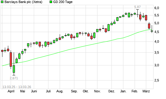 Mit dem Rücksetzer auf 4,51 EUR hat die Barclays Bank-Aktie am 12.03.2026 die 200-Tage-Linie nach unten gekreuzt.