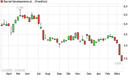 Mit dem Rücksetzer auf 3,43 EUR hat die Barratt Developments-Aktie (ISIN GB0000811801) am 10.03.2026 ein neues 10-Jahres-Tief erreicht und damit den Kurs vom 12.10.2022 eingestellt.