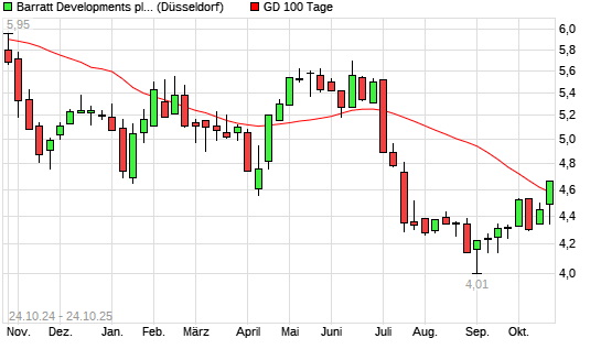 Mit dem Anstieg auf 4,57 EUR hat die Barratt Developments-Aktie am 23.10.2025 die 100-Tage-Linie nach oben gekreuzt.Die Barratt Developments-Aktie befindet sich seit dem 03.07.2025 im langfristigen ...weiterlesen