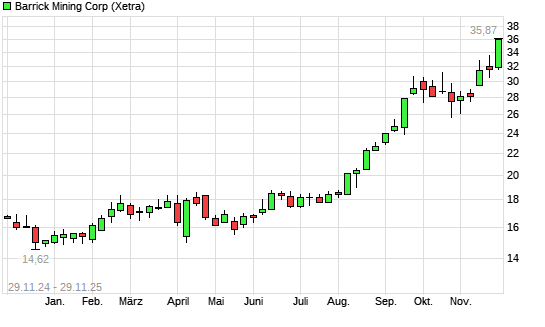 Mit dem Anstieg auf 36,00 EUR hat die Barrick Gold-Aktie (ISIN CA06849F1080) am 28.11.2025 ein neues 10-Jahres-Hoch erreicht und damit den Kurs vom 27.11.2025 eingestellt.