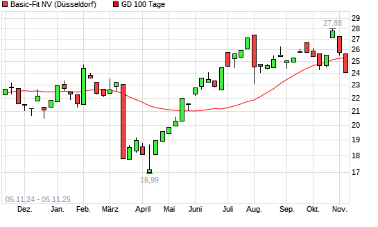 Mit dem Rücksetzer auf 24,42 EUR hat die Basic-Fit-Aktie am 04.11.2025 die 100-Tage-Linie nach unten gekreuzt.