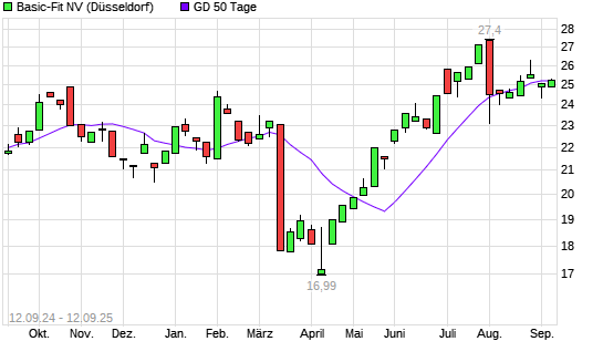 Mit dem Rücksetzer auf 25,08 EUR hat die Basic-Fit-Aktie am 11.09.2025 die 50-Tage-Linie nach unten gekreuzt.