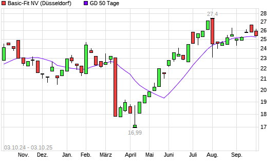Mit dem Rücksetzer auf 25,16 EUR hat die Basic-Fit-Aktie am 02.10.2025 die 50-Tage-Linie nach unten gekreuzt.
