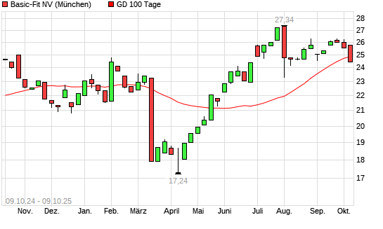 Mit dem Rücksetzer auf 24,26 EUR hat die Basic-Fit-Aktie am 08.10.2025 die 100-Tage-Linie nach unten gekreuzt.Die Basic-Fit-Aktie befindet sich seit dem 23.05.2025 im langfristigen Aufwärtstrend ...weiterlesen