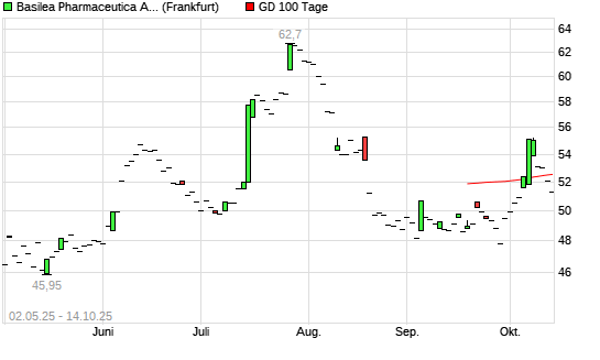 Mit dem Rücksetzer auf 52,10 EUR hat die Basilea Pharmaceutica-Aktie am 13.10.2025 die 100-Tage-Linie nach unten gekreuzt.