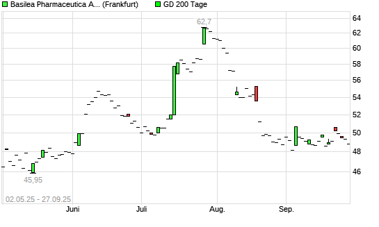 Mit dem Rücksetzer auf 48,80 EUR hat die Basilea Pharmaceutica-Aktie am 26.09.2025 die 200-Tage-Linie nach unten gekreuzt.Die Basilea Pharmaceutica-Aktie befand sich seit dem 18.09.2025 ...weiterlesen