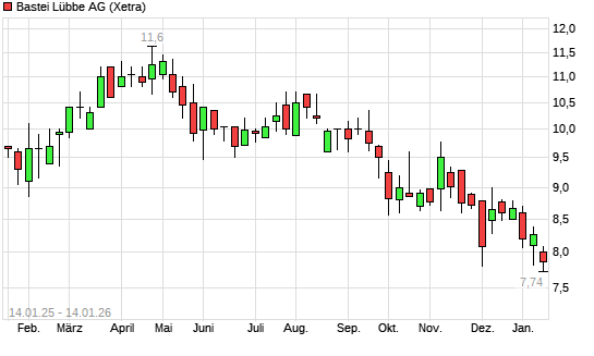 Mit dem Rücksetzer auf 7,80 EUR hat die Bastei Lübbe-Aktie (ISIN DE000A1X3YY0) am 13.01.2026 ein neues 12-Monats-Tief erreicht und damit den Kurs vom 12.01.2026 eingestellt.