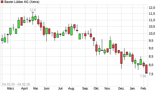 Mit dem Rücksetzer auf 7,70 EUR hat die Bastei Lübbe-Aktie (ISIN DE000A1X3YY0) am 03.02.2026 ein neues 12-Monats-Tief erreicht und damit den Kurs vom 14.01.2026 eingestellt.