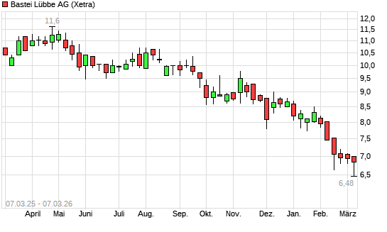 Mit dem Rücksetzer auf 6,56 EUR hat die Bastei Lübbe-Aktie (ISIN DE000A1X3YY0) am 06.03.2026 ein neues 12-Monats-Tief erreicht und damit den Kurs vom 13.02.2026 eingestellt.