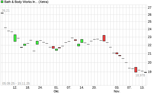 Mit dem Rücksetzer auf 18,74 EUR hat die Bath & Body Works-Aktie (ISIN US0708301041) am 14.11.2025 ein neues 5-Jahres-Tief erreicht und damit den Kurs vom 12.11.2025 eingestellt.