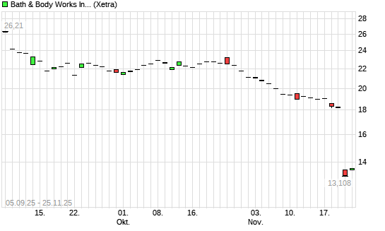 Mit dem Rücksetzer auf 13,01 EUR hat die Bath & Body Works-Aktie (ISIN US0708301041) am 24.11.2025 ein neues 5-Jahres-Tief erreicht und damit den Kurs vom 21.11.2025 eingestellt.