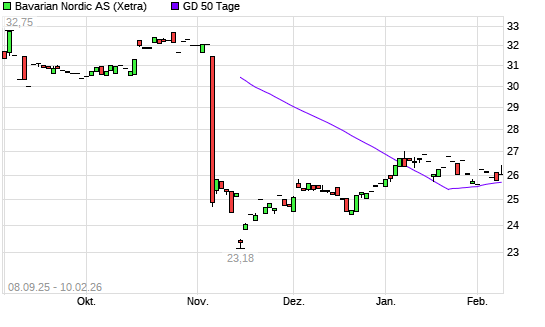 Mit dem Rücksetzer auf 25,53 EUR hat die Bavarian Nordic-Aktie am 09.02.2026 die 50-Tage-Linie nach unten gekreuzt.