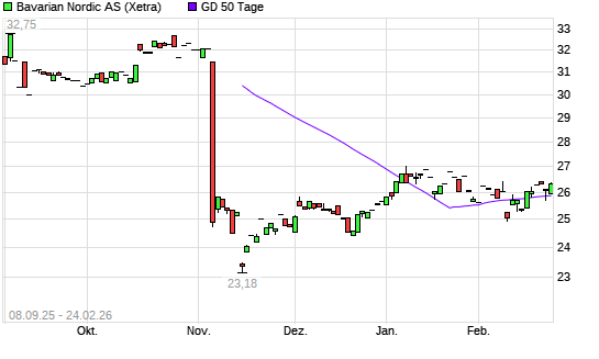 Mit dem Rücksetzer auf 25,51 EUR hat die Bavarian Nordic-Aktie am 23.02.2026 die 50-Tage-Linie nach unten gekreuzt.