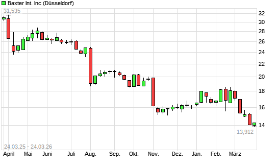 Mit dem Rücksetzer auf 14,29 EUR hat die Baxter International-Aktie (ISIN US0718131099) am 23.03.2026 ein neues 10-Jahres-Tief erreicht und damit den Kurs vom 20.03.2026 eingestellt.