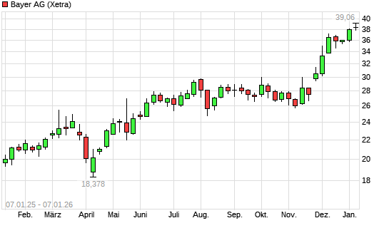 Mit dem Anstieg auf 38,44 EUR hat die Bayer-Aktie (ISIN DE000BAY0017) am 06.01.2026 ein neues 12-Monats-Hoch erreicht und damit den Kurs vom 05.01.2026 eingestellt.