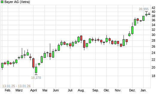 Mit dem Anstieg auf 39,73 EUR hat die Bayer-Aktie (ISIN DE000BAY0017) am 12.01.2026 ein neues 12-Monats-Hoch erreicht und damit den Kurs vom 08.01.2026 eingestellt.