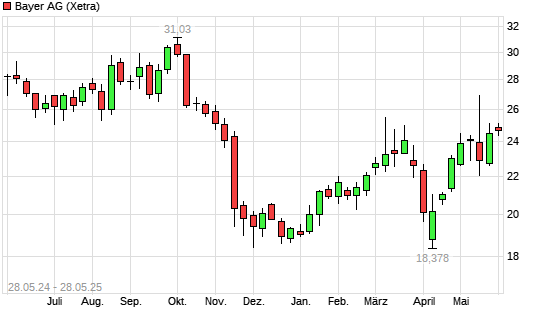 Mit dem Anstieg auf 25,00 EUR hat die Bayer-Aktie (ISIN DE000BAY0017) am 27.05.2025 ein neues 6-Monats-Hoch erreicht und damit den Kurs vom 18.03.2025 eingestellt.