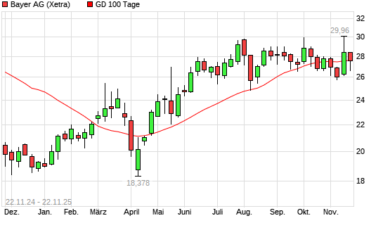 Mit dem Anstieg auf 27,75 EUR hat die Bayer-Aktie am 21.11.2025 die 100-Tage-Linie nach oben gekreuzt.