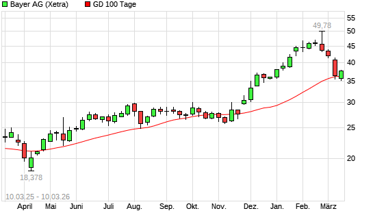 Mit dem Anstieg auf 38,12 EUR hat die Bayer-Aktie am 09.03.2026 die 100-Tage-Linie nach oben gekreuzt.