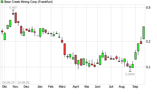 Mit dem Anstieg auf 0,28 EUR hat die Bear Creek Mining-Aktie (ISIN CA07380N1042) am 23.09.2025 ein neues 6-Monats-Hoch erreicht und damit den Kurs vom 15.09.2025 eingestellt.