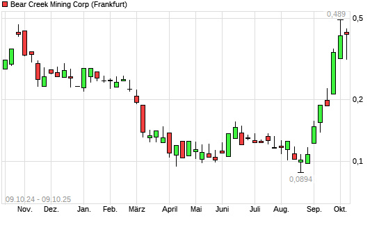 Mit dem Anstieg auf 0,44 EUR hat die Bear Creek Mining-Aktie (ISIN CA07380N1042) am 08.10.2025 ein neues 6-Monats-Hoch erreicht und damit den Kurs vom 30.09.2025 eingestellt.