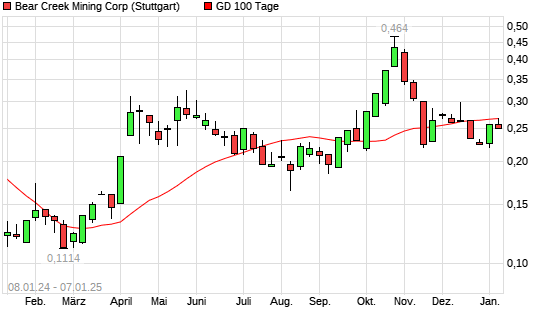 Mit dem Rücksetzer auf 0,26 EUR hat die Bear Creek Mining-Aktie am 06.01.2025 die 100-Tage-Linie nach unten gekreuzt.