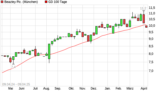 Mit dem Anstieg auf 10,10 EUR hat die Beazley-Aktie am 08.04.2025 die 100-Tage-Linie nach oben gekreuzt.