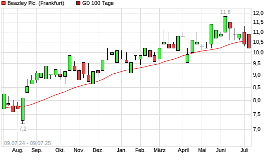 Mit dem Rücksetzer auf 10,20 EUR hat die Beazley-Aktie am 08.07.2025 die 100-Tage-Linie nach unten gekreuzt.