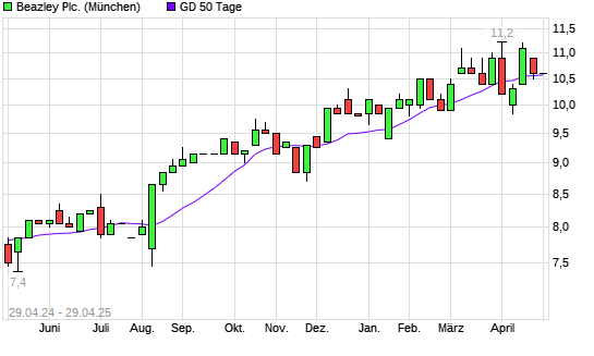 Mit dem Rücksetzer auf 10,30 EUR hat die Beazley-Aktie am 28.04.2025 die 50-Tage-Linie nach unten gekreuzt.